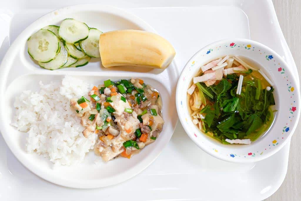 今日の給食こんだては、ごはん、麻婆豆腐、きゅうりの中華風、野菜スープ、バナナ