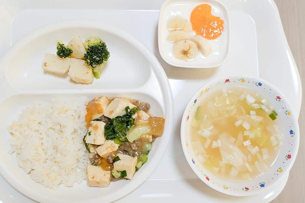 今日の給食こんだては、マージンごはん、冬瓜入り麻婆豆腐、ごまじゃが、中華スープ、バナナヨーグルト添え