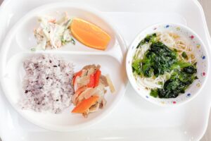 今日の給食こんだては、マージンごはん、冬瓜入り麻婆豆腐、ごまじゃが、中華スープ、バナナヨーグルト添え