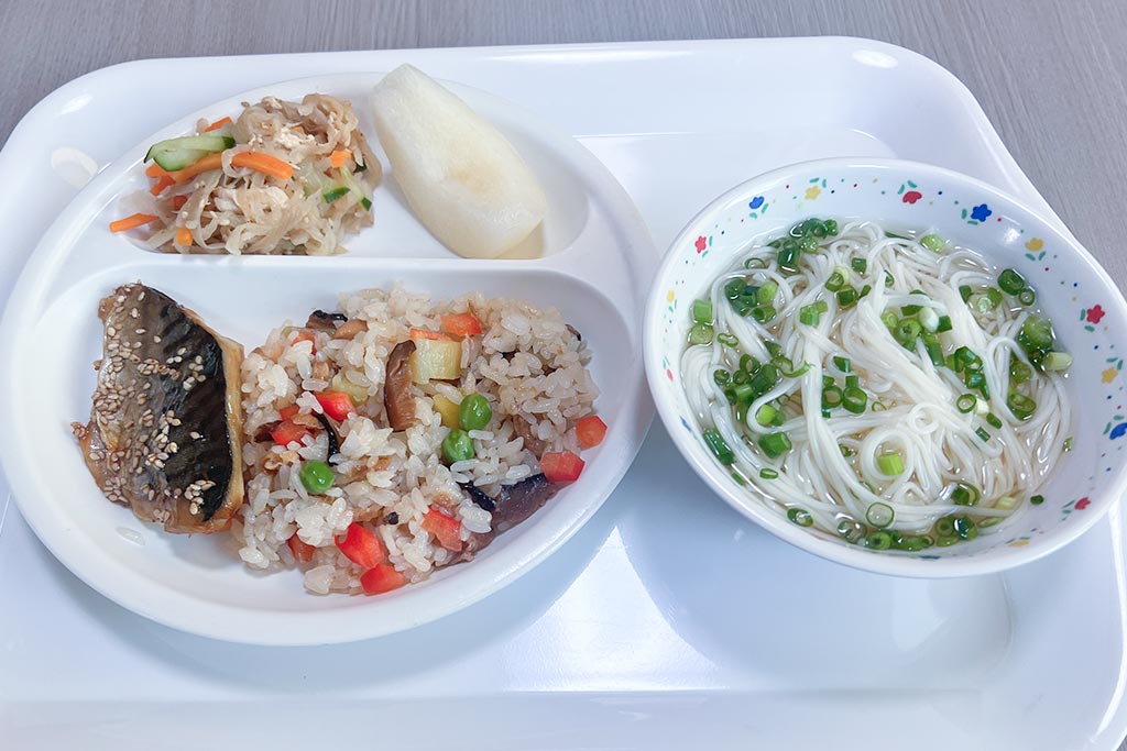 今日の給食こんだては、秋の香り混ぜごはん、さばのゴマだれ焼き、切干大根のゴマ酢あえ、そうめん汁、梨