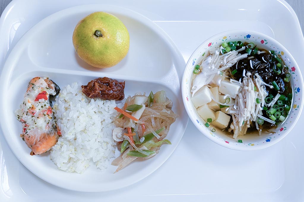 今日の給食こんだては、ごはん(アンダースー添え)、鮭のタルタル焼き、春雨の中華炒め、もずくスープ、みかん