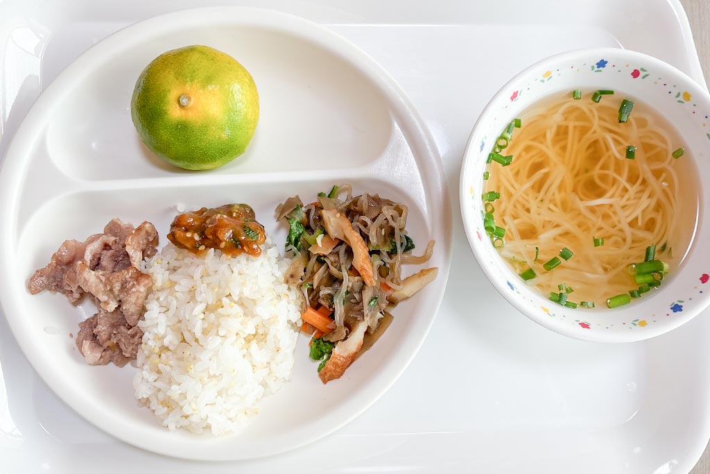 今日の給食こんだては、マージンごはん、納豆みそ、豚肉のマーマレード焼き、きんぴらごぼう、そうめん汁、みかん