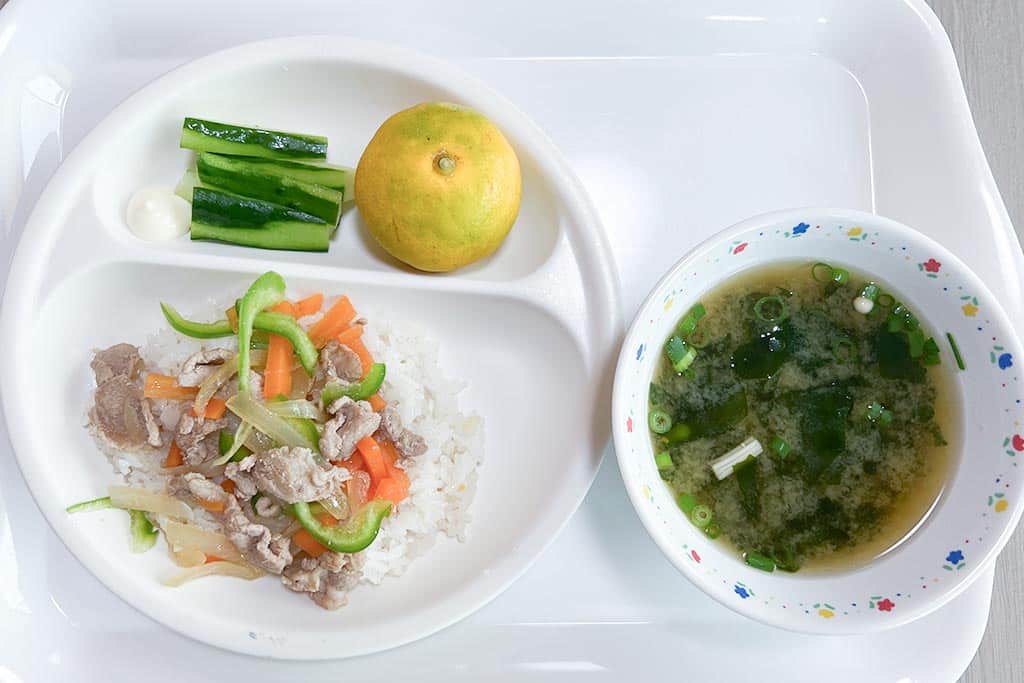 今日の給食こんだては、豚焼肉どんぶり、スティックきゅうりマヨネーズ、みそ汁、みかん血や肉・骨となる、豚肩ロース・わかめ熱や力となる、精白米・強化米・白ゴマ体の調子をよくする、玉ねぎ・人参・ピーマン・きゅうり・えのきたけ・ねぎ・みかん