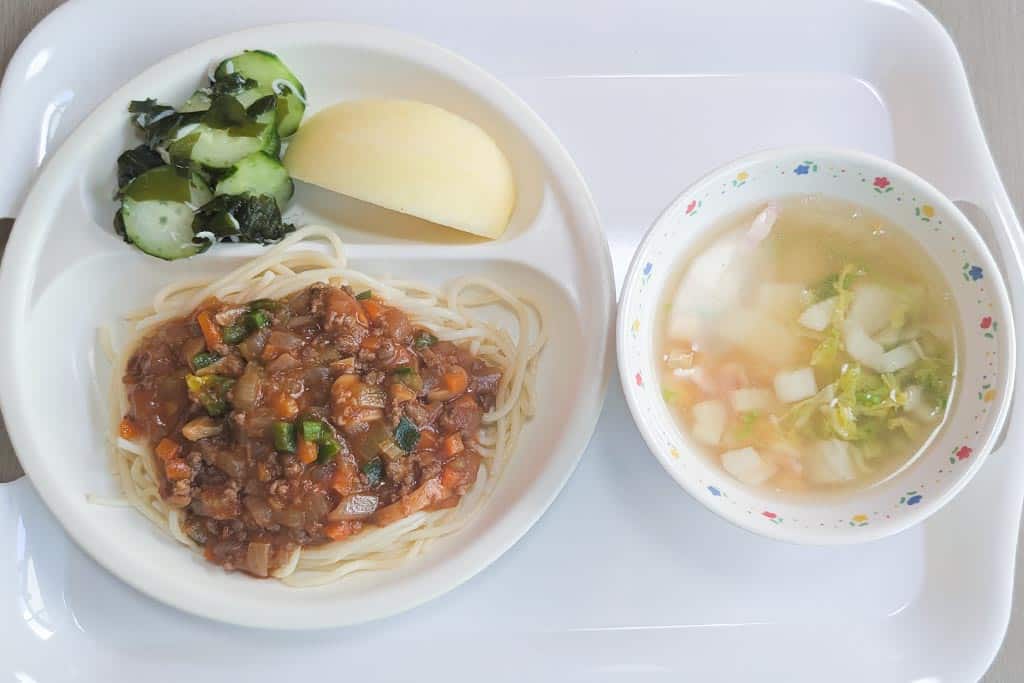 今日の給食こんだては、スパゲティミートソース、きゅうりの甘酢和え、コーンスープ、りんご