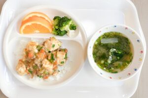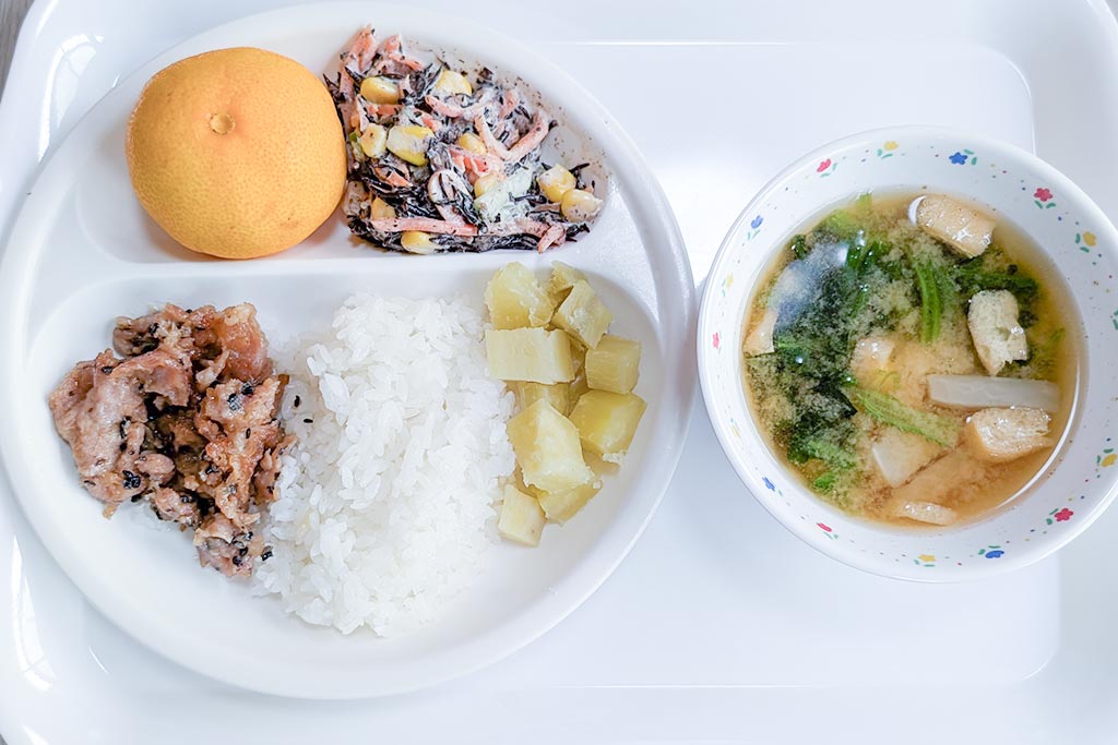 今日の給食こんだては、ごはん、豚肉のゴマ照り焼き、ころころ蒸し芋、ひじきのマヨサラダ、みそ汁、みかん