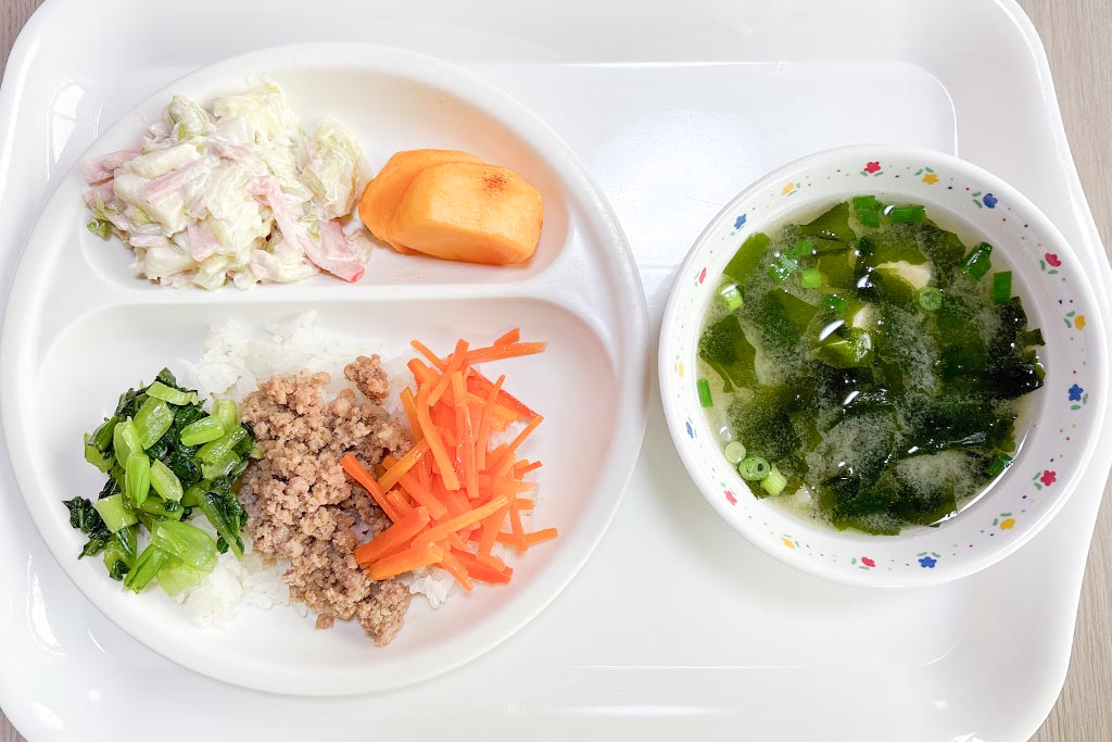 今日の給食こんだては、三色ごはん、キャベツのツナマヨあえ、大根と豆腐のみそ汁、柿血や肉・骨となる、豚ひき肉・鶏ひき肉・ツナ・豚レバー・ちくわ熱や力となる、精白米・強化米体の調子をよくする、人参・小松菜・大根・ねぎ・柿