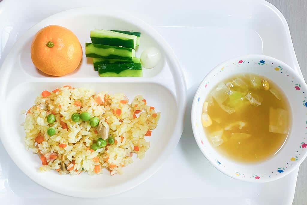 今日の給食こんだては、カレーピラフ、スティックきゅうりマヨネーズ、キャベツとコーンのスープ、みかん血や肉・骨となる、鶏もも肉・ハム熱や力となる、精白米・強化米体の調子をよくする、人参・グリーンピース・きゅうり・コーン・キャベツ・みかん