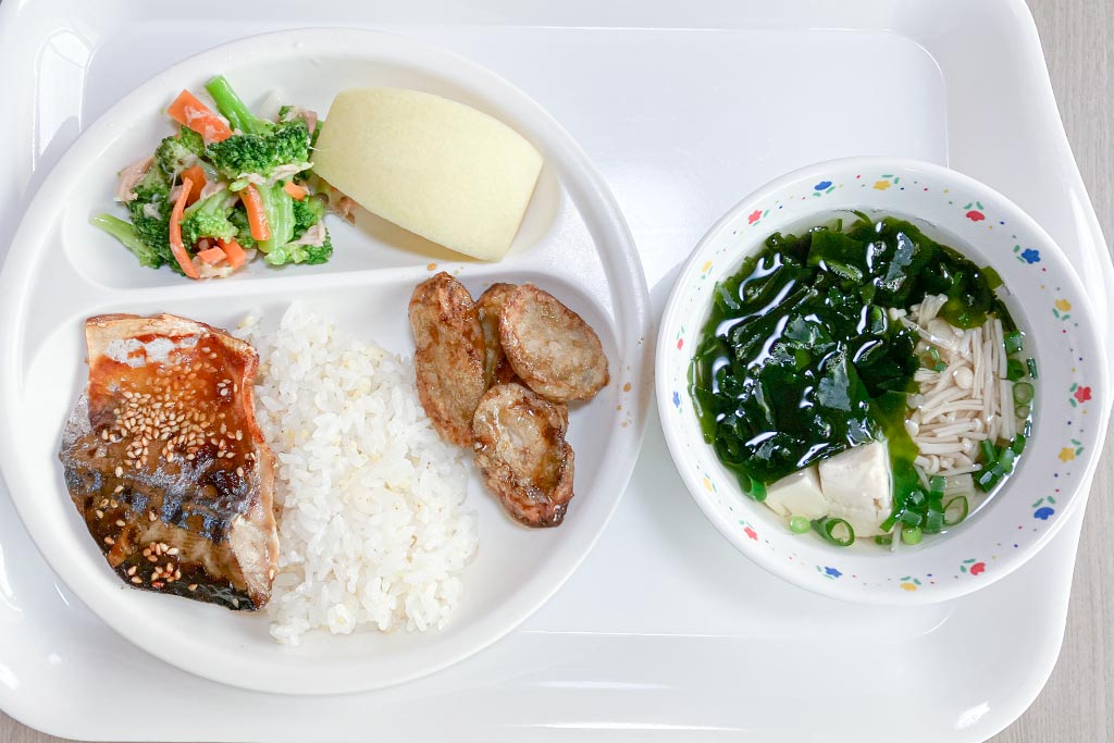 今日の給食こんだては、マージンご飯、さばのみそ焼き、かみかみごぼう、ブロッコリーのマリネ、すまし汁、りんご