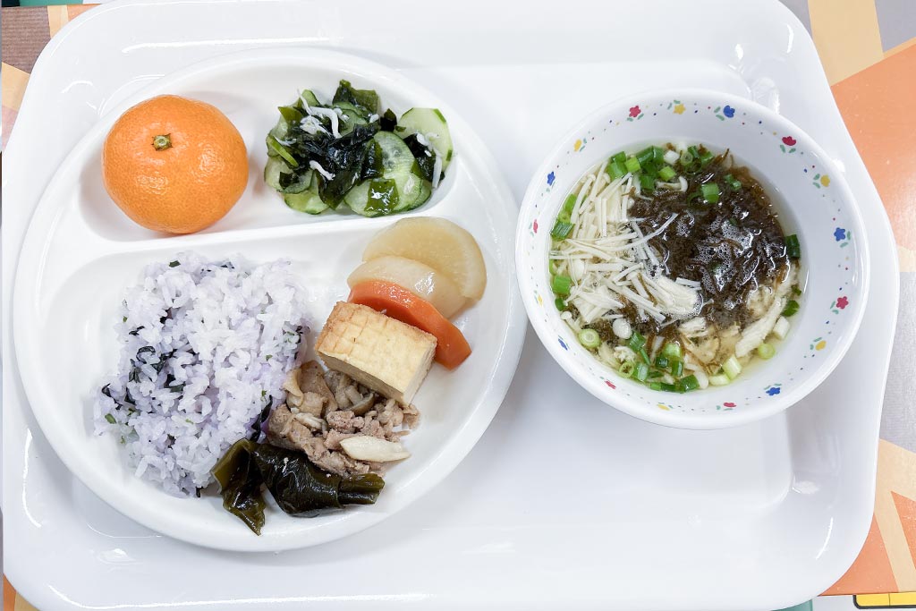 今日の給食こんだては、ハンダマごはん、沖縄風煮つけ、きゅうりの甘酢和え、もずくえのき汁、みかん