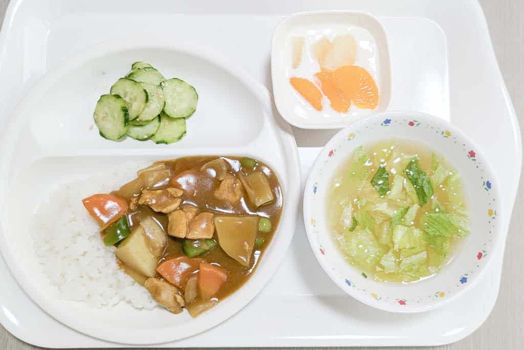 今日の給食こんだては、チキンカレー、カリカリきゅうり、フルーツヨーグルト添え、コーンスープ