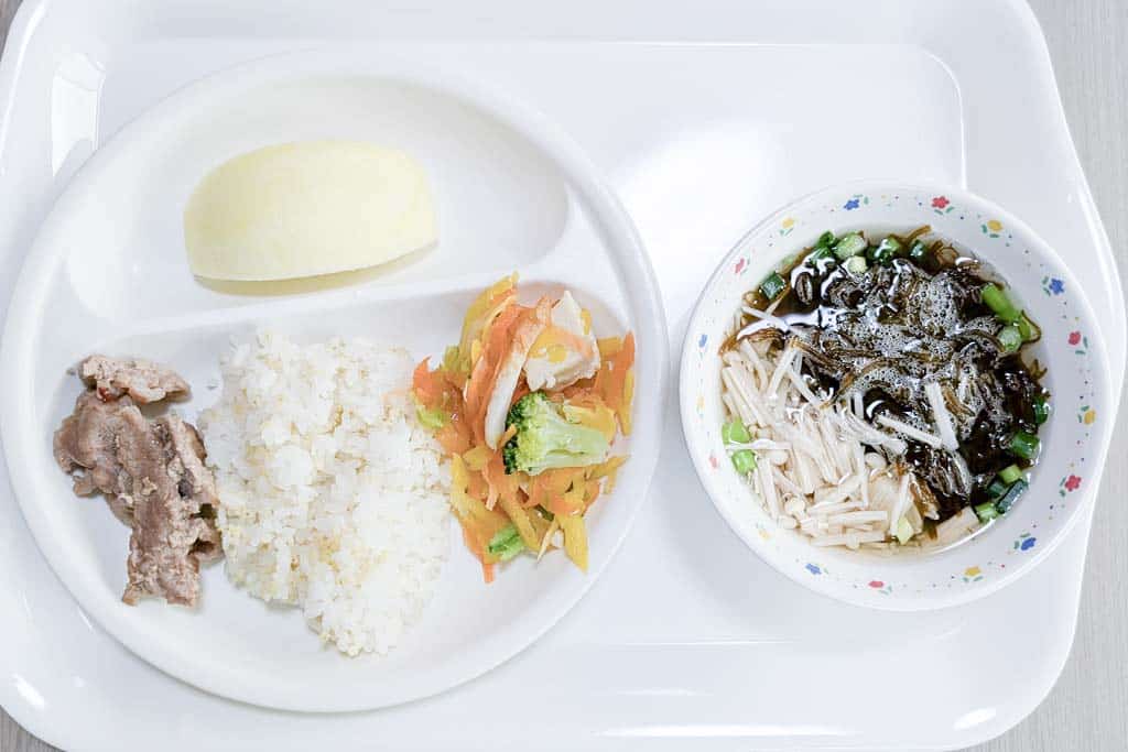 今日の給食こんだては、マージンごはん、納豆みそ、豚肉のマーマレード焼き、豆腐の島人参炒め、もずくスープ、りんご