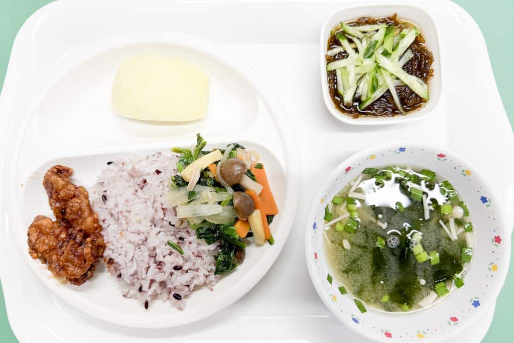 今日の給食こんだては、黒米ごはん、レバーのかんりん揚げ、野菜炒め、もずくの酢物、みそ汁、りんご