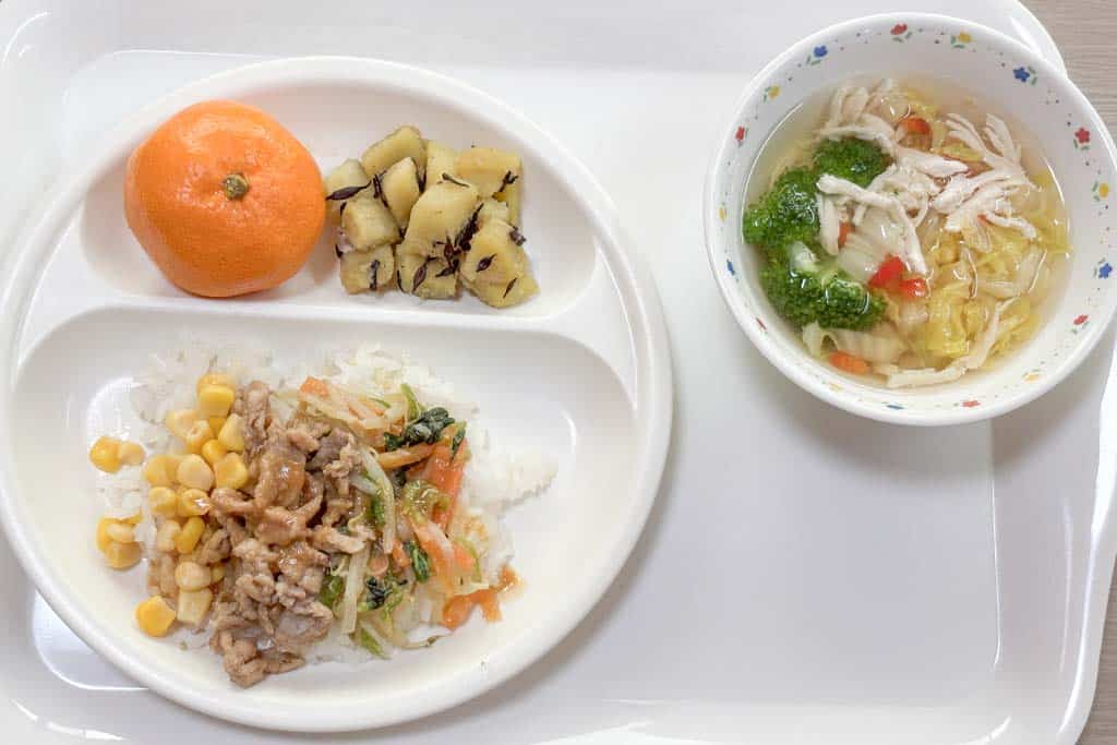 今日の給食こんだては、豚肉ビビンバ、芋とひじきのサラダ、白菜スープ、バナナ