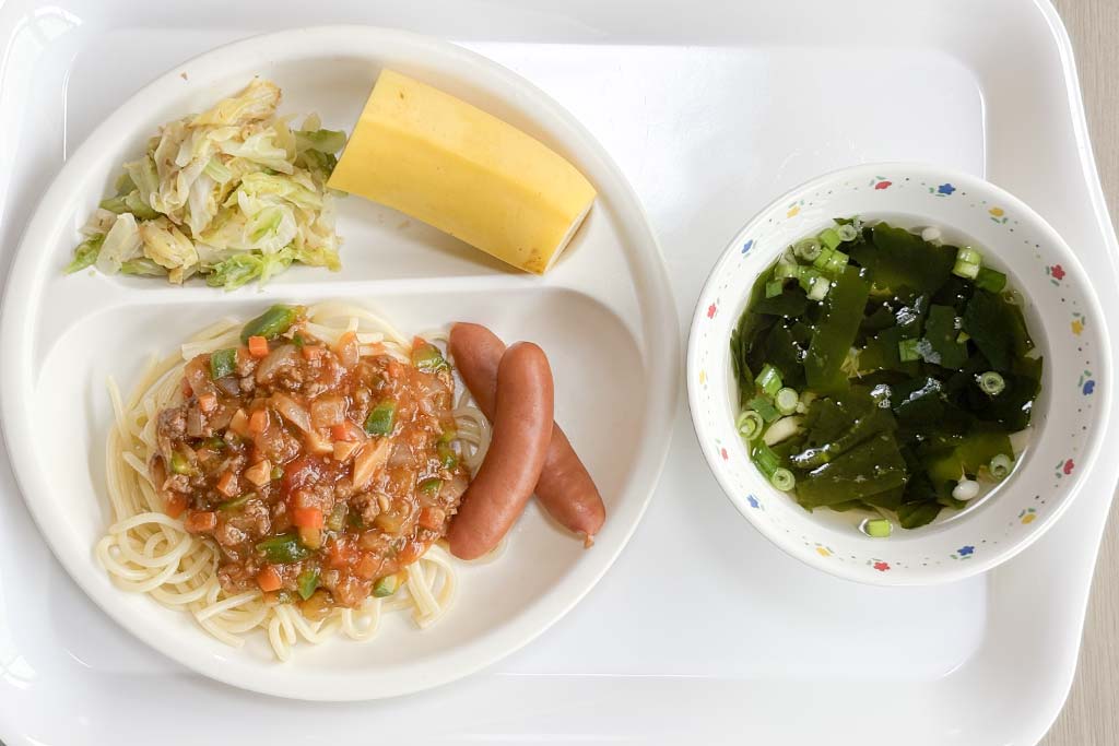 今日の給食こんだては、スパゲティミートソース、ボイルウインナー、キャベツのおかかあえ、すまし汁、バナナ