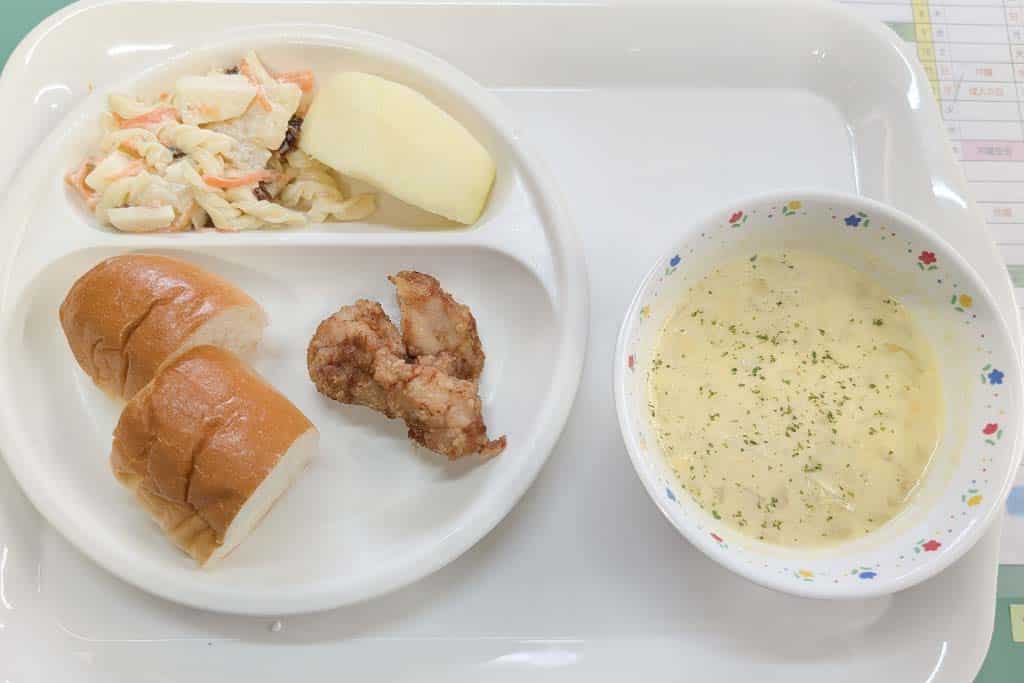 今日の給食こんだては、ロールパン、鶏のから揚げ、マカロニサラダ、パンプキン豆乳スープ、りんご