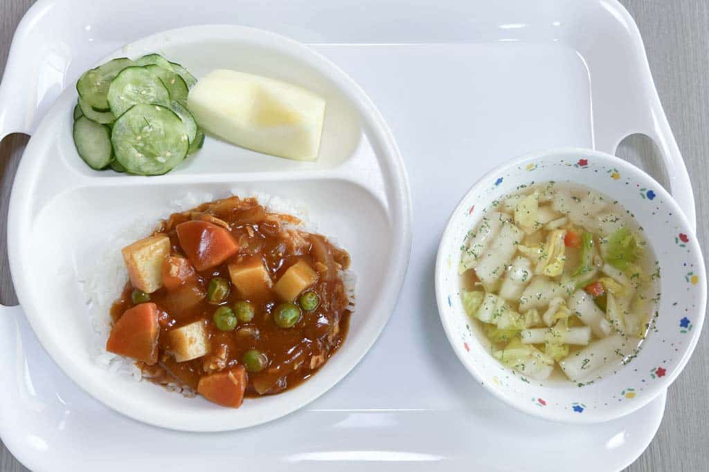 今日の給食こんだては、ハヤシライス、カリカリきゅうり、白菜スープ、りんご血や肉・骨となる、鶏ささみ・ベーコ熱や力となる、白菜・強化米・じゃがいも・白ごま体の調子をよくする、玉ねぎ・人参・グリーンピース・きゅうり・白菜・ピーマン・タンカン