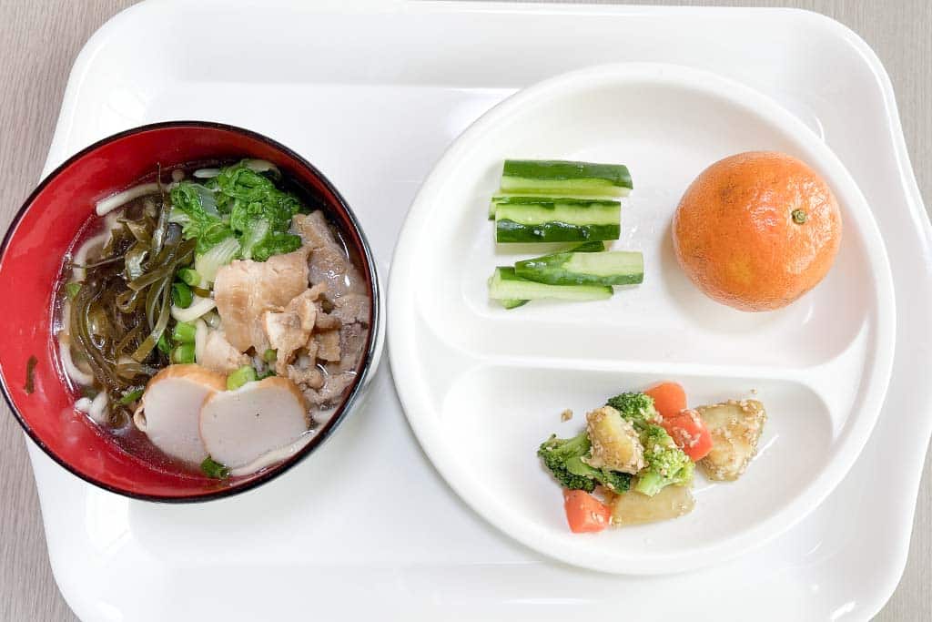 今日の給食こんだては、沖縄そば、さつまいもの胡麻和え、スティックきゅうり、タンカン血や肉・骨となる、豚三枚肉・かまぼこ熱や力となる、沖縄そば・さつまいも・白ごま体の調子をよくする、刻み昆布・山東菜・ねぎ・人参・さやいんげん・きゅうり・タンカン