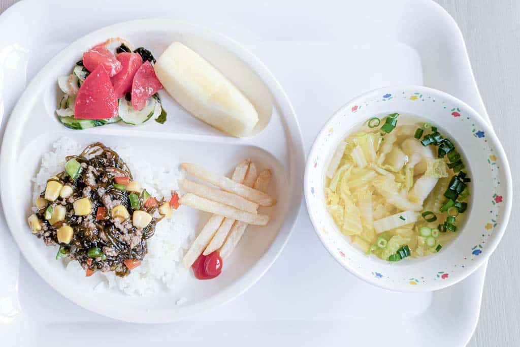 今日の給食こんだては、もずくどんぶり、トマトときゅうりの酢みそあえ、フライドポテト、魚と白菜のスープ、りんご