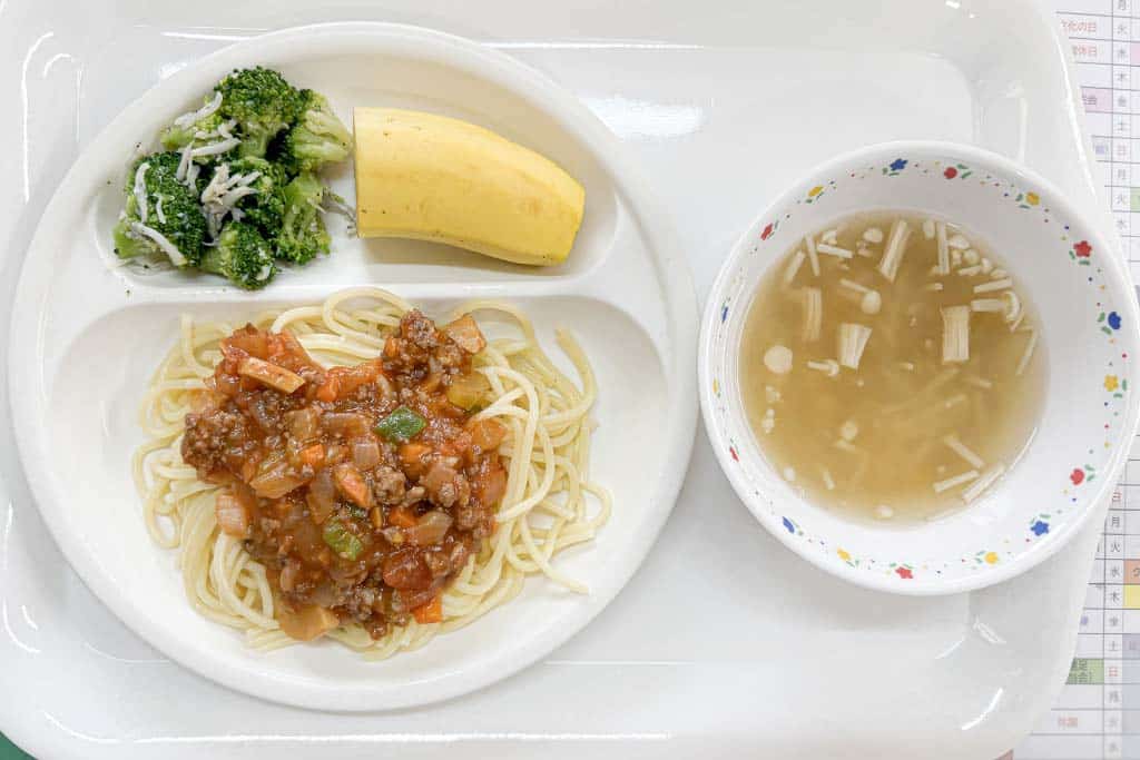 今日の給食こんだては、スパゲティミートソース、ブロッコリーのしらすあえ、コーンスープ、バナナ